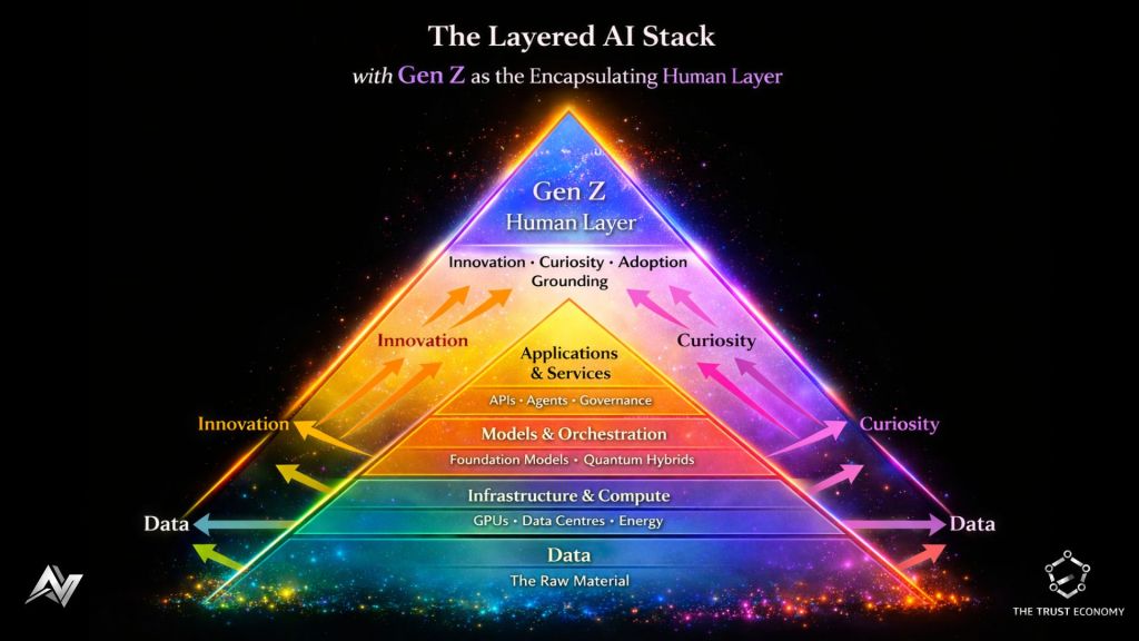 This article traces the stack’s evolution using the latest data available in March 2026: the IEA’s Electricity 2026 report (released February 2026), the Stanford AI Index 2025 (the most recent comprehensive edition), McKinsey’s Quantum Technology Monitor 2025, Deloitte’s 2025 Gen Z and Millennial Survey (global findings), and UN demographic projections. It then repositions Gen Z as an outer, encapsulating human pyramid: this pyramid envelops the inner technology layers (data, infrastructure, applications), both surrounding and permeating them. Gen Z, as this outer pyramid, radiates influence inward and outward, accelerating innovation at every level. The evidence-based hypothesis: 2026–2035 is the decade when this human force becomes the ultimate multiplier, collapsing decades of progress into years and shifting global AI leadership toward youthful nations. By 2040–2050, this external pyramid will mature into a global talent mesh, making AI’s benefits as widespread as electricity.